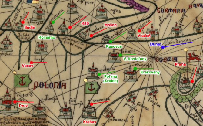 Pre určenie slovenských stredovekých lokalít na mape si najprv stanovíme oporné body pre zorientovanie sa na mape. Rozpoznávame mestá Viedeň, Prahu, Krakov, Ľvov, Budín a samozrejme pomôže nám rieka Dunaj (pohľad je obrátený, severo-južný).
