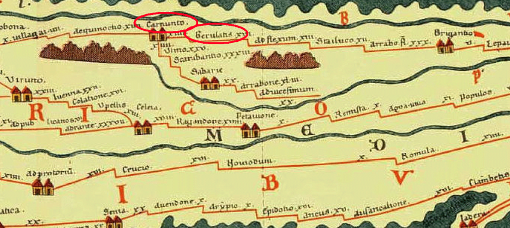 Obr. Tabula Peutingeriana a zvýraznené tábory Carnuntum a Gerulata