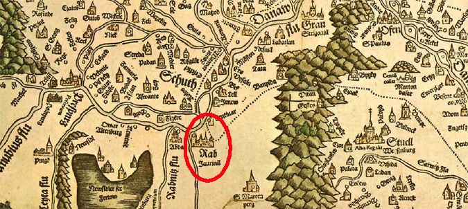 Obr. Mapa Tabula Hungariae z roku 1526 a mesto Ráb zapísané ako TAURINIUS
