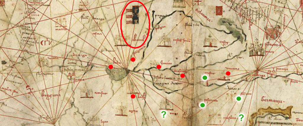 Na detaile staršej Dulcertovej mapy z roku 1339 vidíme drobné zmeny oproti atlasu z roku 1375. Na mape síce opäť rozpoznávame Rusovce, Veľké Kostoľany a Poľanu (vyznačené zelenými bodmi), ale Komárno a Krakovany už zakreslené nie sú. Pribudli nám však dve nové mestá na Slovensku (ťažšie čitateľné nápisy, zatiaľ zvýraznené otáznikom).